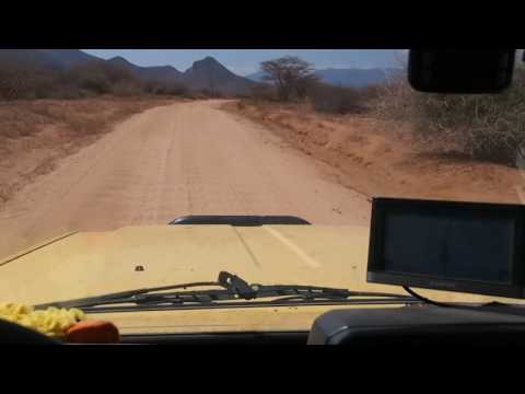 Na ca. 50 km kent mijn GPS de naar rechts (noord) afwijkende grindweg niet meer, en stuurt me in plaats daarvan rechtdoor over een dirtroad. Ik besluit daar in mee te gaan, omdat het me een erg mooie weg lijkt en het lijkt directer op mijn doel af te gaan. De eerste kilometers zijn inderdaad erg mooi. Een typisch Afrikaans landschap met rode aarde en veel acaciabomen. Hoewel hobbelig is het pad prima te doen. Dan kom ik uit in een nogal breed uitgemeten dorp: Ngurunit. Tussen de bomen staan hier en daar rondje hutjes en kleine, stenen gebouwtjes. Tussendoor lopen talloze paadjes, en mensen in prachtige uitdossingen. Er wordt vriendelijk gezwaaid en er hangt een hele ontspannen sfeer. Het is lastig om het dorp goed te omschrijven, want het is heel anders dan alle andere dorpen waar ik tot op heden doorheen ben gereden. Het dorp ademt de sfeer van een frontiertown in het wilde westen. Het is wel lastig om het juiste paadje te blijven volgen, want ook mijn GPS kent vele tientallen van de soms bijna parallel lopende paadjes en het is vaak gokken welke je moet hebben. Eén keer neem ik een paadje dat eindigt in een afgrond, waardoor ik hard op de rem moet trappen. Omstanders wijzen me breed glimlachend het juiste pad naar beneden aan en ik bedank ze hartelijk. Ik heb tot dusver al heel wat droge rivierbeddingen doorkruist, maar deze is wel erg breed. Zo breed dat het pad door het losse zand uitgewist is en ik even moet zoeken naar de plek om de oever weer op te komen. Aan de overkant houdt het mooie dorp op en rijd ik even later weer alleen door het schitterende landschap. Mijn lunch gebruik ik op een prachtig plekje onder een breed uitwaaierende acacia. Ik ben op mijn hoede voor wilde dieren (om te spotten en om niet zelf lunch te worden), maar ik geniet enorm van de rust van dit plekje. Het is voor het eerst in lange tijd dat ik weer ergens rustig kan lunchen. En ik blijk goed gekozen te hebben, want een paar kilometer verderop kom ik uit bij de grindweg die ik een stuk voor Ngurunit verlaten had. Hier loopt wel het een en ander aan volk rond (waaronder een vriendelijk zwaaiende man met een grote speer in zijn hand) en zo nu en dan komt er een auto langs.